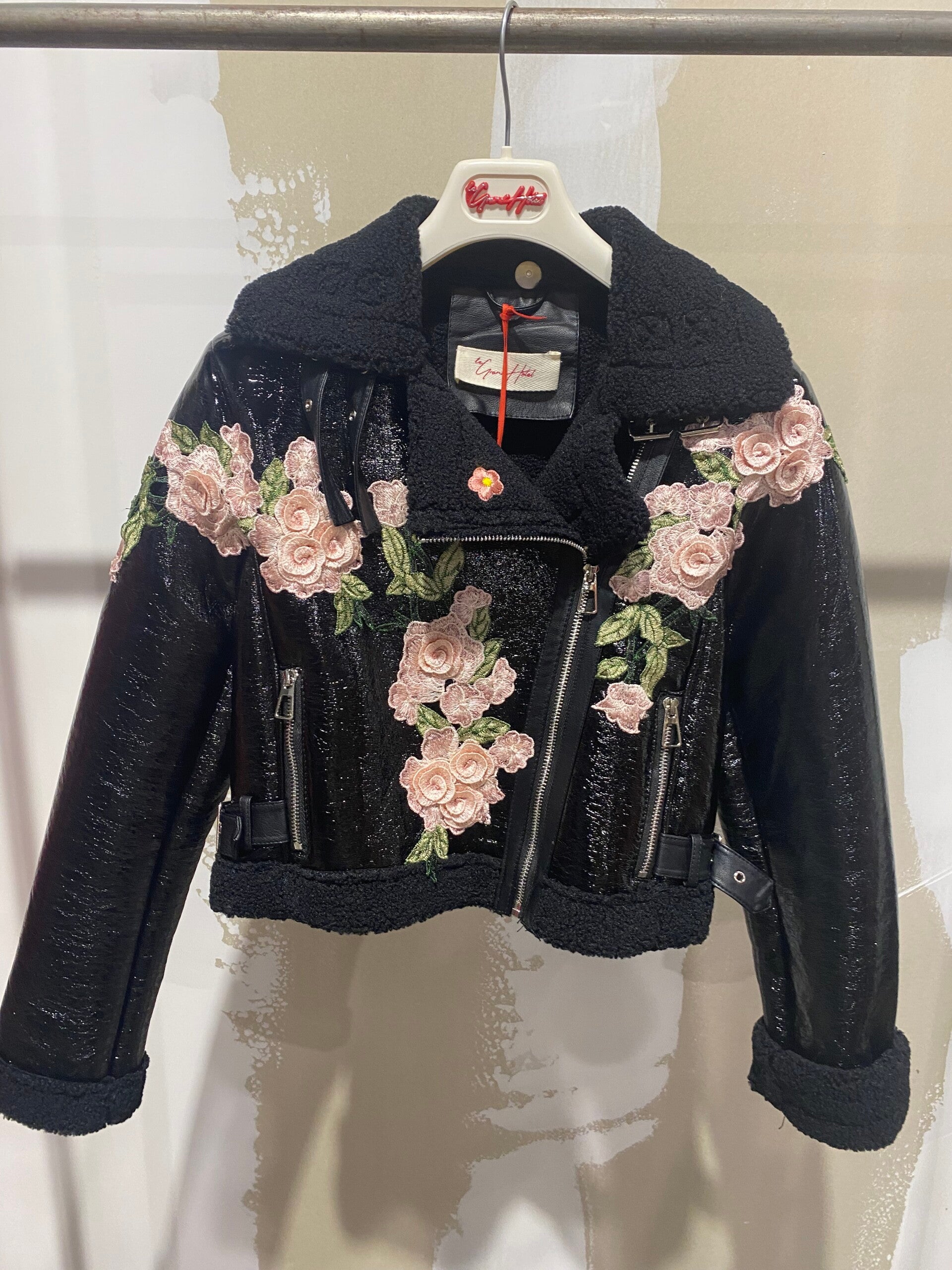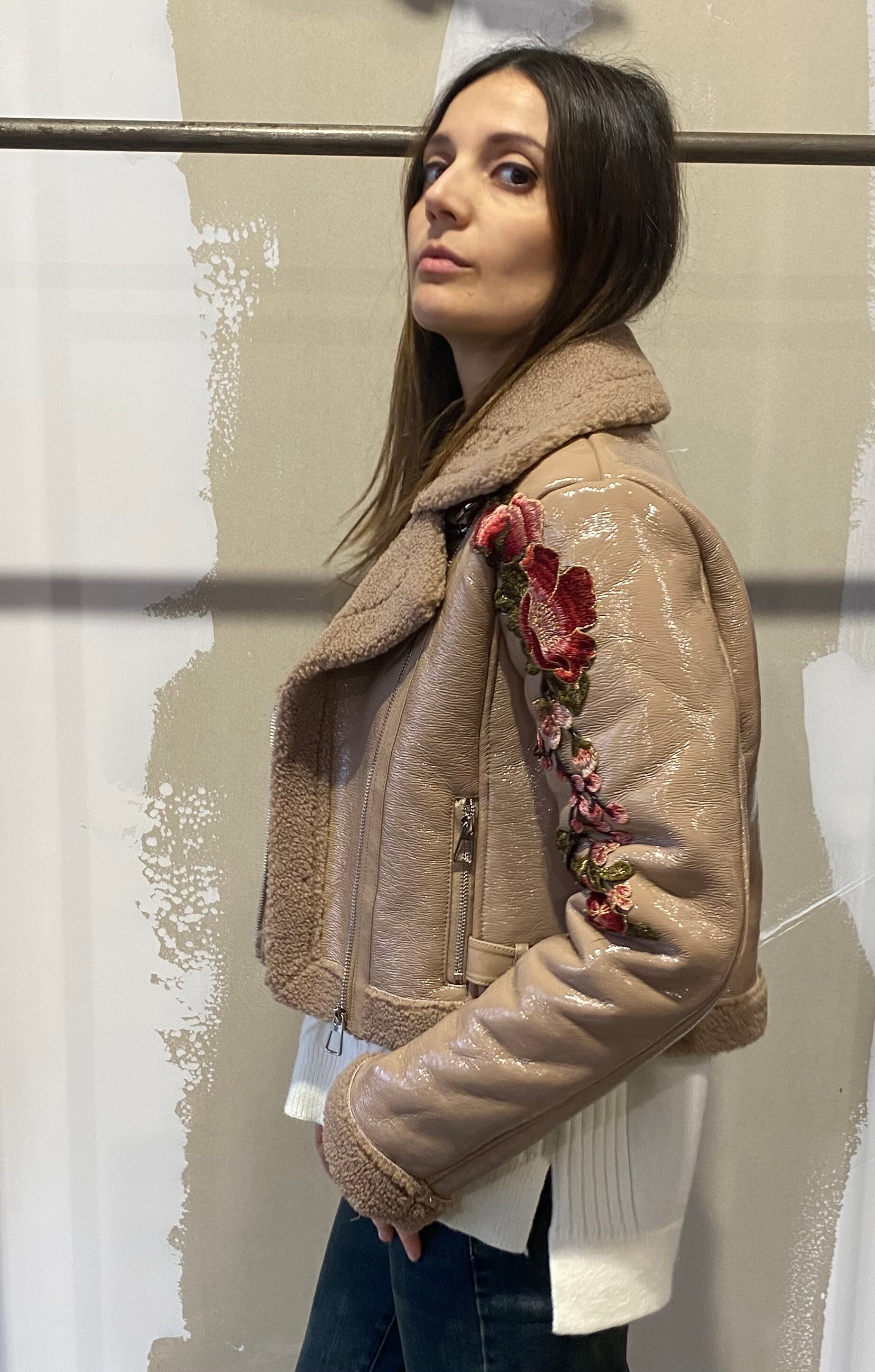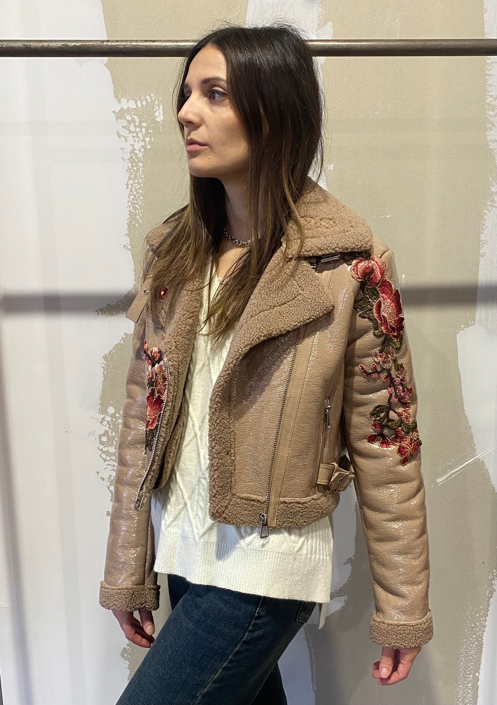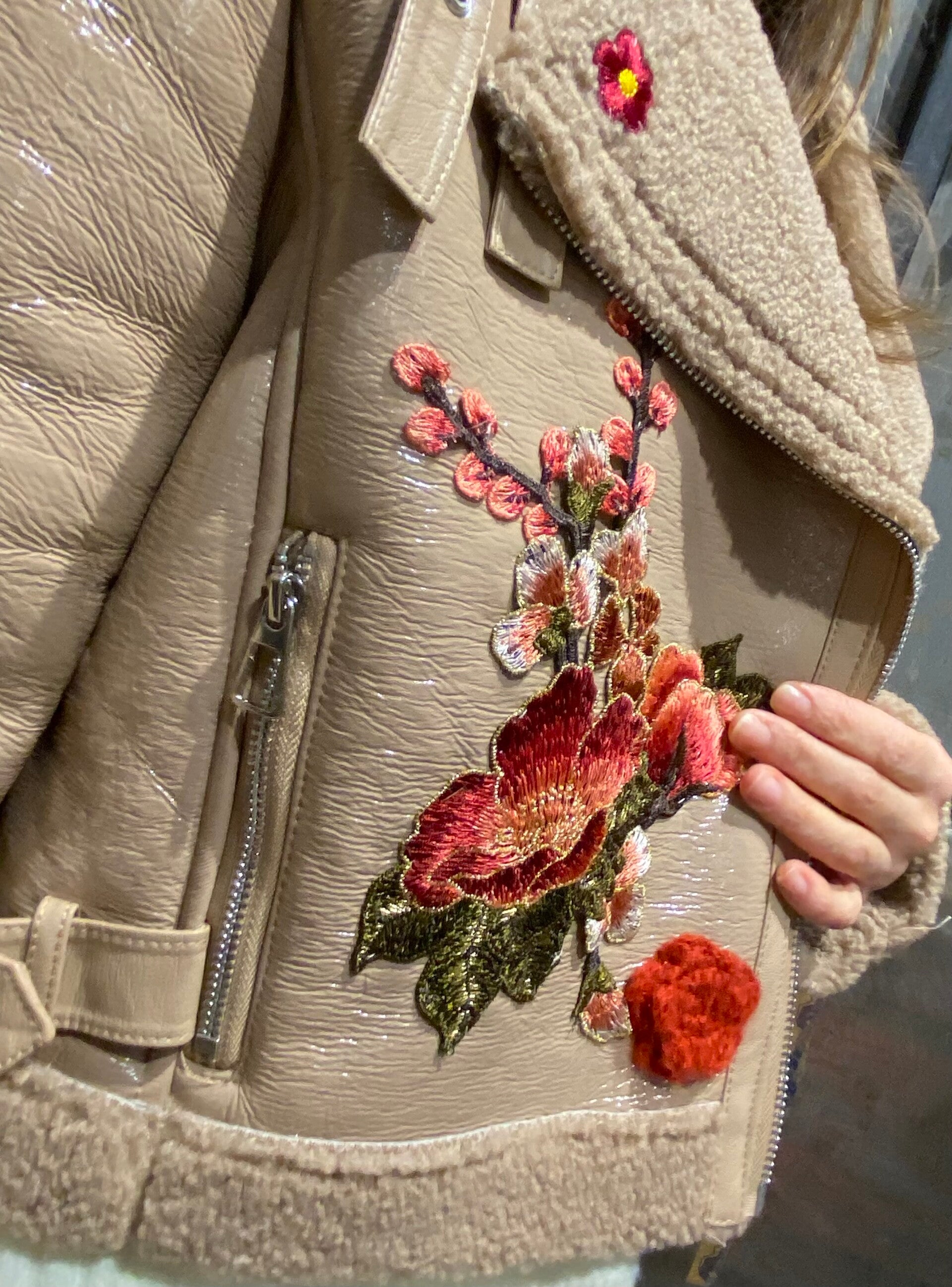 Top trench coat con dettagli floreali applicati a mano .
