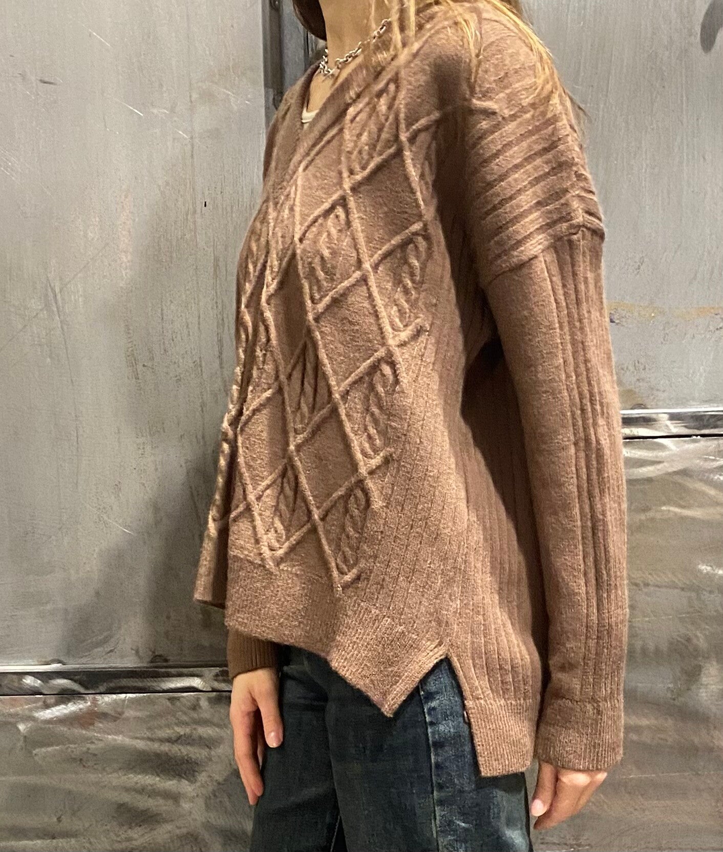 Maglioncino con rombi e trecce , scollo V e fondo asimmetrico .